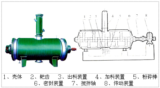 具有結構簡單,操作方便,使用周期長,性能穩定可靠,蒸汽耗量小,適用性能強,產品質量好,特別適用于不耐高溫、易燃、調溫下易氧化的膏狀物料的干燥,該機經用戶長期使用證明是一良好的干燥設備。原理:被干燥物料從殼體上方正中間加入,在不斷正反轉動的耙齒的攪拌下,物料軸向來回走動,與殼體內壁接觸的表面不斷更新,受到蒸汽的間接加熱,耙齒的均勻攪拌,粉碎棒的粉碎,使物料表面水分更有利的排出,氣化的水分經干式除塵器、濕式除塵器、冷凝器,從真空泵出口處放空。結構:真空耙式干燥機的主要部件